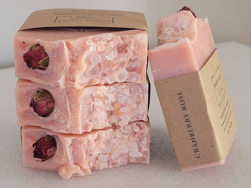 A unique combination of rose clay, dried mini roses, and cranberry rose fragrance oil creates a luxurious bar that is sure to become a favorite. Add chunky pink himalayan salt for exfoliation and skin softening. It holds all the benefits of its ingredients while providing a deep clean that leaves you feeling new again.